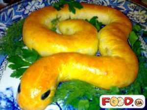 Из маслины вырезаем глаза, приложить к змее. Смазать яйцом. Выпекать в разогретой духовке при 190* до румяной корочки.