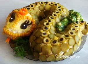 Тонкими кружками нарезаем маринованные огурцы и выкладываем из них чешую змеи. Глаза и узор из маслин. Жало и корона из морковки.