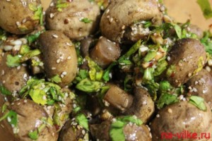 Грибы отвариваем в подсоленной воде в течение 20минут. Откидываем грибы на дуршлаг, чтобы стекла жидкость. Делаем маринад: в растительное масло добавляем соевый соус, мелко нарезанные зелень, чеснок, горький перец, тмин, лавровый лист, яблочный уксус, молотый кориандр и перемешиваем. Кунжут жарим на сухой сковородке до золотистого цвета. Добавляем кунжут в маринад и перемешиваем. В маринад добавляем шампиньоны, перемешиваем. Оставляем на 12 часов в холодном месте. Закуска готова!