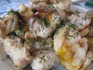 Подготовленное рыбное филе со шкуркой, нарезают кусками весом 30-40г, добавляют нарезанный кольцами лук,солят, перчат, добавляют уксус,разведенный в воде с сахаром и ставят в холодное место на 5-6 часов.