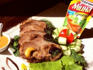 Чернослив без косточек промыть, слегка запарить. Переложить пласты мяса черносливом. Смешать горчицу, майонез, соль и специи, что бы получилась смесь для маринования.